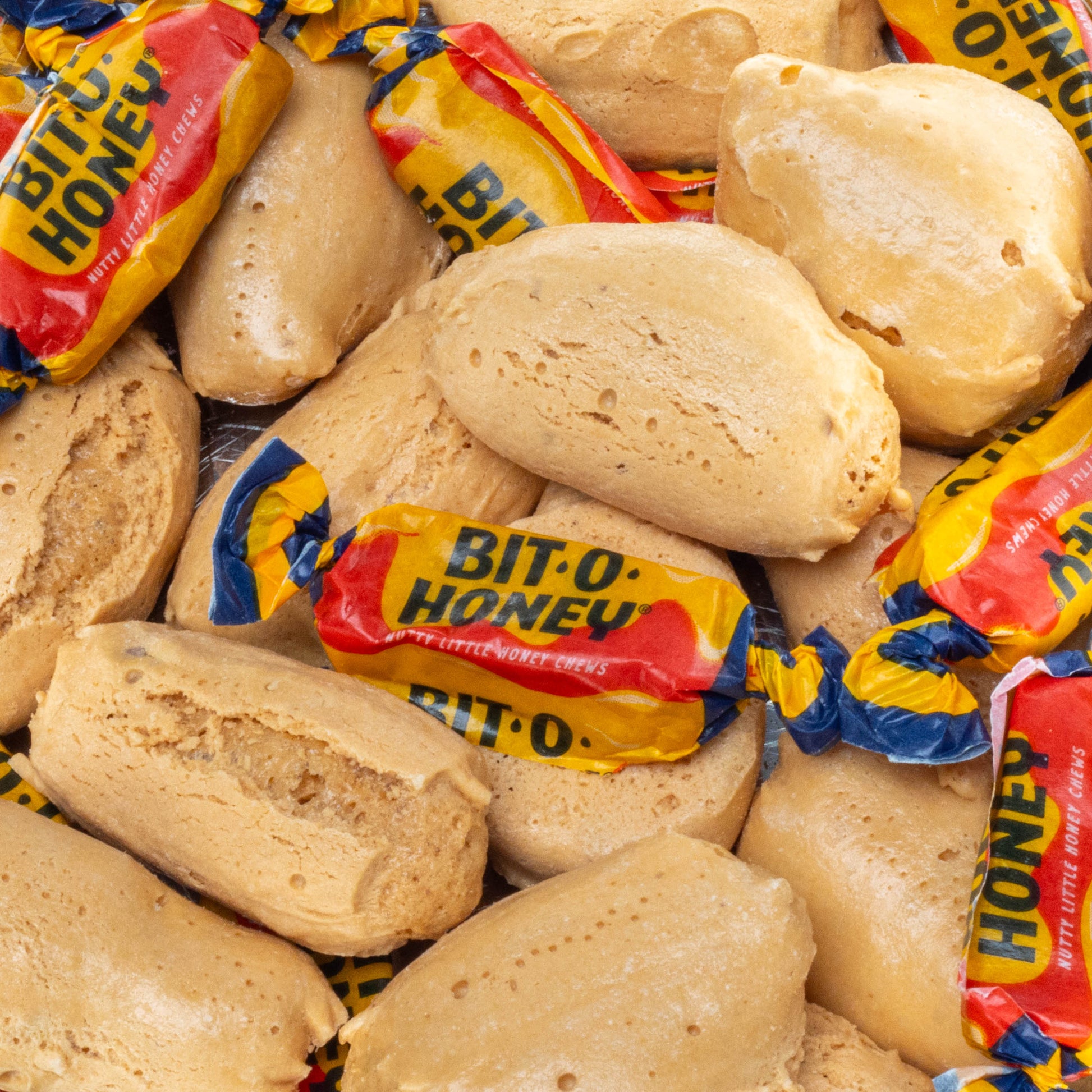 Bit-O-Honey®: Corn Syrup, Sugar, Nonfat Milk, Hydrogenated Coconut Oil, Almonds, Honey, Salt, Egg Whites, Natural Flavour. Suitable for vegetarians. Allergens: Contains milk, almonds, and egg.