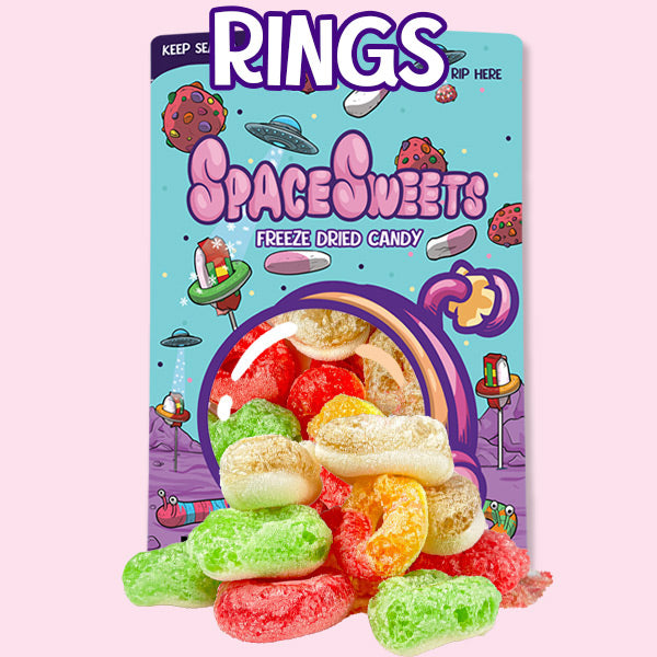 All the best freeze dried rings include: Peach Rings, Cola Rings, Strawberry Rings, Apple Rings