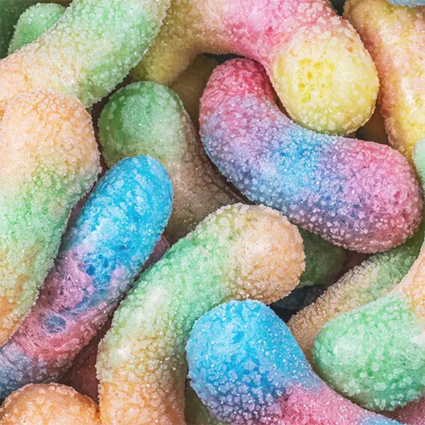 Freeze Dried Fizzy Worms. Light crunchy airy... like big fruity wotsits!