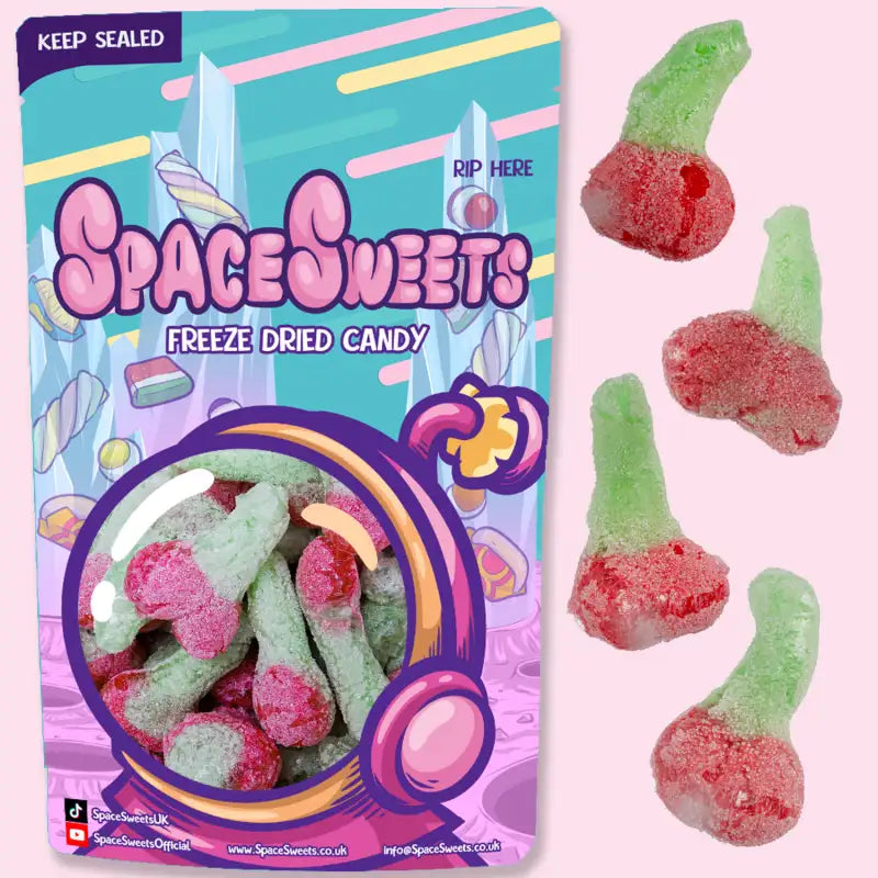 We've finally found the best gummy twin cherries for freeze drying, after over a year of trial and error we bring you freeze dried twin cherries. Just the right texture of crunch you want from a freeze dried sweet accompanies with punchy cherry flavour and a dusting of mouth watering sour dust. We think these are the best tasting and looking cherries you can find... and trust me we've tried A LOT of them!