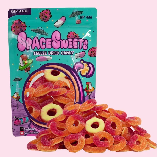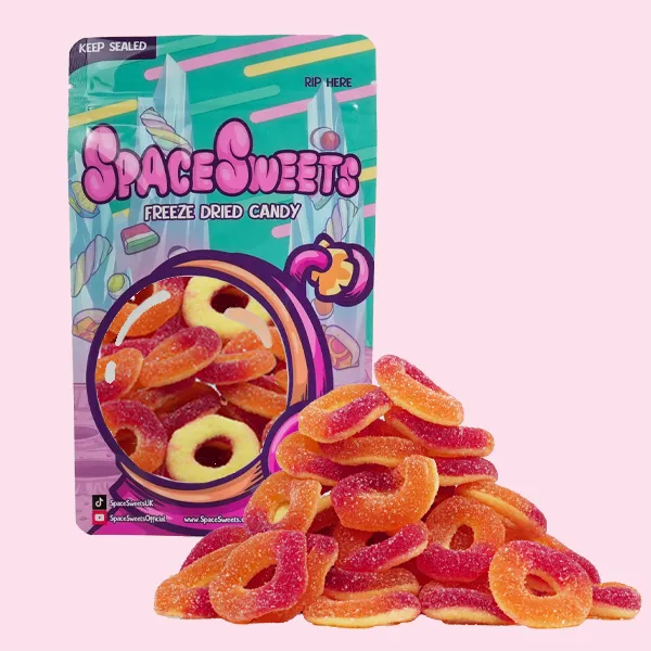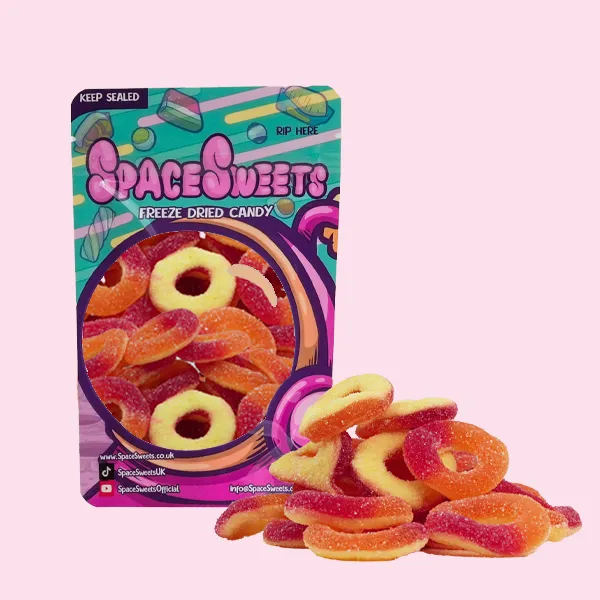 Delicious fizzy peach-flavoured rings with a jelly top and a foam bottom!